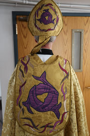 Scale appliqué of fish triquetra, celtic cross appliqués on stole